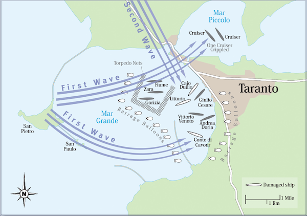 A map of Taranto Harbour on 11 November 1940, showing the position of the Italian ships, the habour defences, and the direction of the British torpedo bomber attack waves.